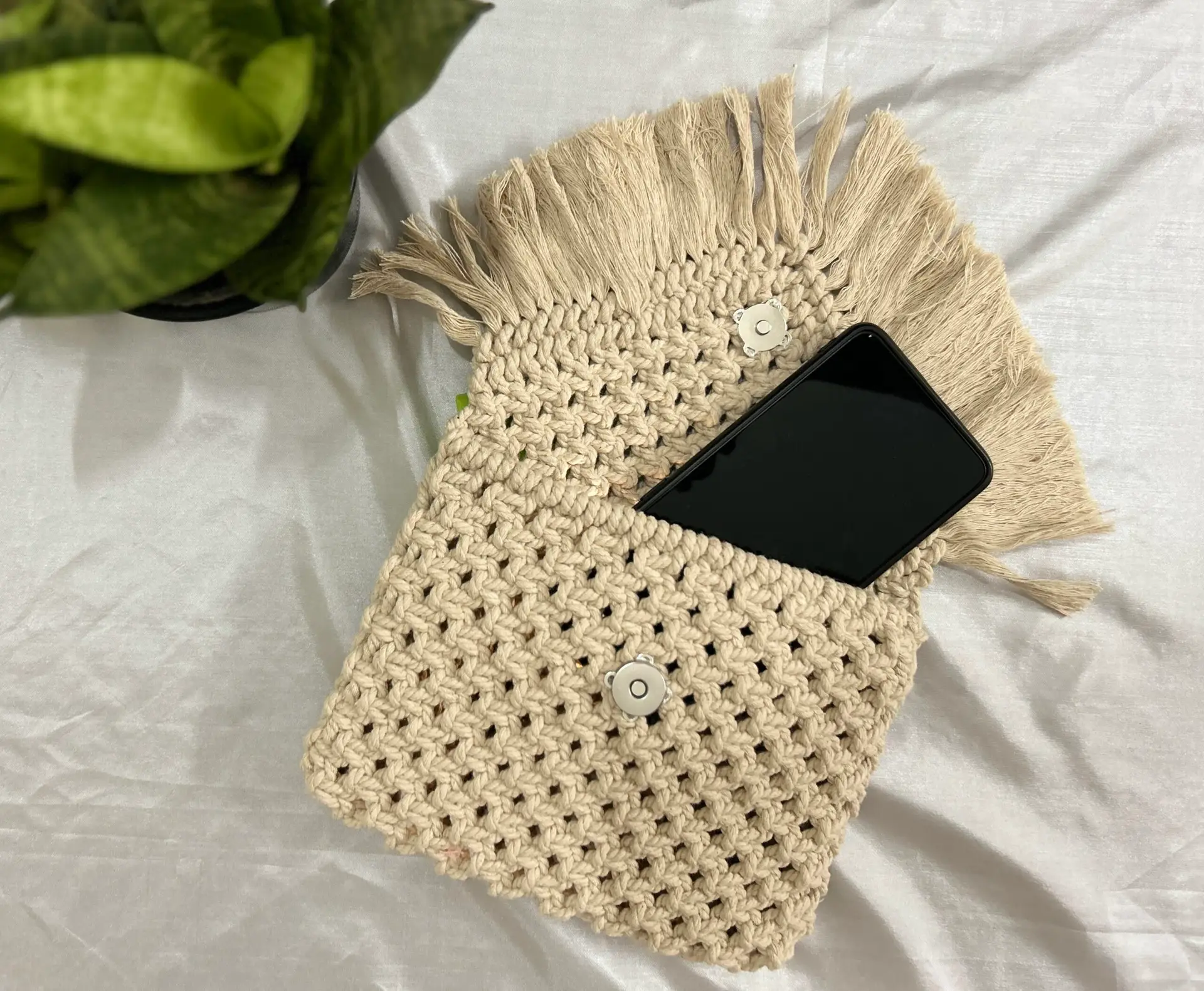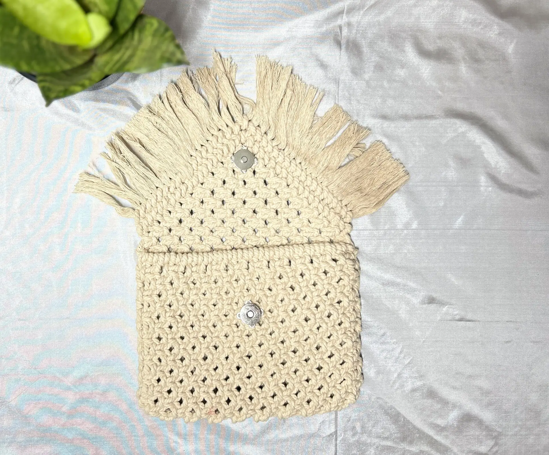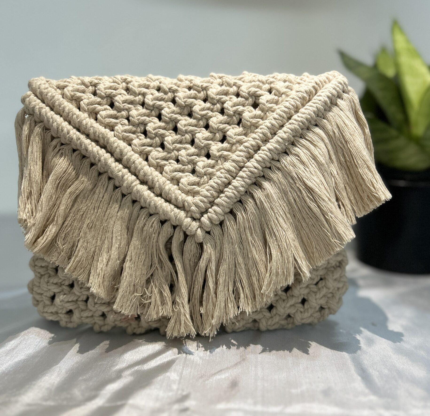 Macrame clutches are stylish and unique accessories handcrafted using the art of macrame, a form of textile-making that involves knotting cords in various patterns. These clutches are often made from durable materials like cotton or jute, giving them a natural and rustic look. Here are some features and details commonly associated with macrame clutches: